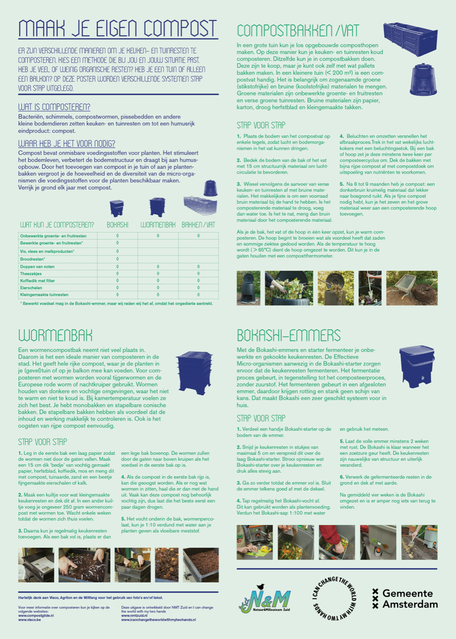 Je kunt zelf in je keukenkastje, op je balkon of in je tuin jouw keukenresten composteren. Op ons terrein staan verschillende composteersystemen die je kunt bekijken zoals de wormtoren, Bokashi-emmers of compostbakken. Op onze 'Composteren in de stad' poster (zie afbeelding links) worden deze composteersystemen stap voor stap uitgelegd. Een papieren versie kunnen we naar je toe sturen (kosten 2 euro). Stuur daarvoor een e-mail naar: info@icanchangetheworldwithmytwohands.nl.